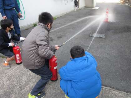 また、消火器の使い方体験では、「火事だ!」と声を出し、消火器を運び、ピンを抜いてしっかり狙って消火するまでの一連の動きを教えていただきました。