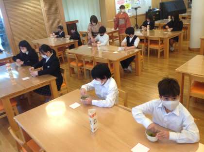 学校にある茶室にて茶道の基本を学び、ランチルームにてお茶点てと茶菓子を楽しみました。