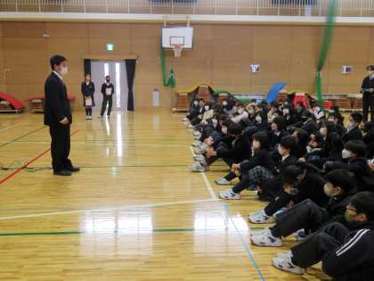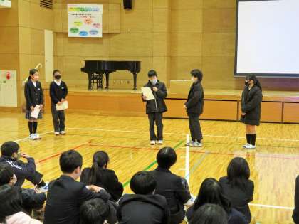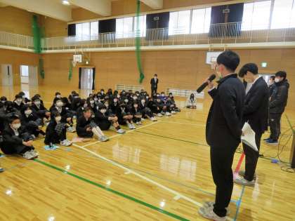 明日から始まる乗鞍スキー研修に向けて、今日の4時間目に『団結式』が行われました。リーダー会の司会・進行のもと、「よし!がんばるぞ!」と思えるような、そんな良い式を行うことが出来ました。