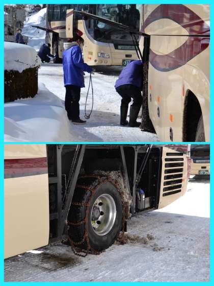 タイヤにチェーンをつけ、これから山道です。後少しで到着します。