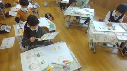 図工の学習では、2年生での思い出の1枚を絵具を使って描いています。2年生のことを振り返りながら楽しそうに話をしながら描く姿がたくさん見られていました。