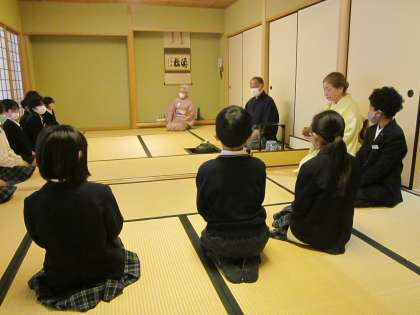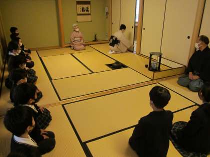 掛け軸や茶花などが飾られ、講師の方々は着物を着ておられたので、子どもたちはとてもよい緊張感をもっていました。