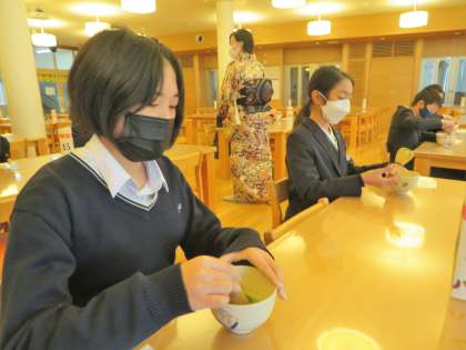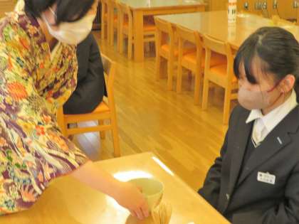 ランチルームでは、干菓子をいただいて抹茶を点てました。先日の道徳の学習で学んだ“相手を敬ったり、気遣ったりする気持ちを形として表す作法”はできましたか?