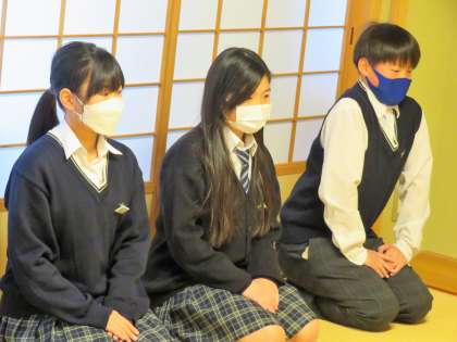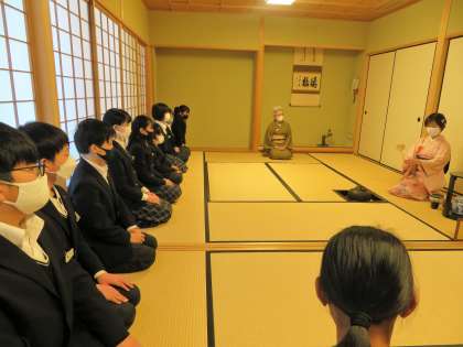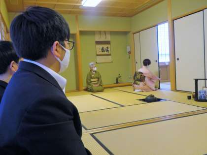 清蓮の間では、ゲストティーチャーの方々に“お点前”を見せていただき、お点前の所作や正客の方の動きの一つ一つの作法の意義についても教えていただきました。