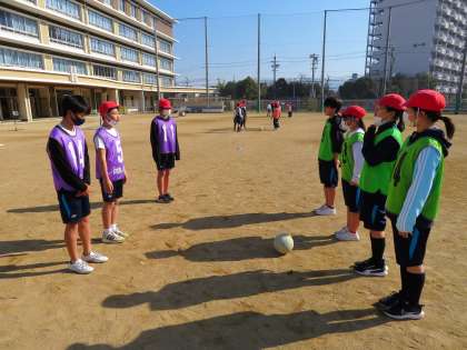 体育の『サッカー』の学習も大詰めを迎えています。チームごとに攻撃や守備の作戦を立てて、頭も使いながらサッカーのゲームを楽しんでいます。
