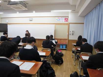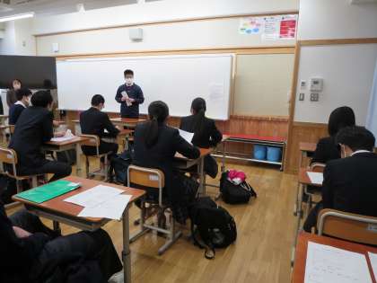 3月8日(水)に京都府公立高等学校の中期選抜学力検査が行われます。7日(火)の放課後、前日指導を行いました。入試に挑む生徒たちは緊張感を持ち、真剣に話を聞いていました。