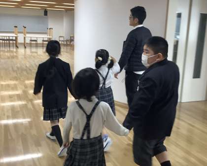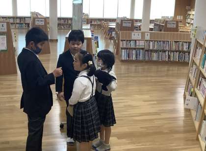 5・6年生が2人ペアになって紹介したい場所(教室や特別教室、遊び場所)にぬいぐるみをかくします。1年生がぬいぐるみを見つけると、その場所について説明します。