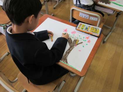 2年生初めての図工の授業は春をテーマにパスを使って絵を描きました。