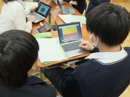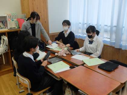 9年生の蓮花タイムでは今,修学旅行で行く愛媛県の各地域の町おこしプランを作成しています。作成のためにグループごとに協力をして各地域の魅力や課題について調べ、魅力を活かし、課題を解決するためにはどのようなことができるかを考えています。