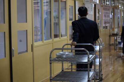 そんな状況から、当番ではない生徒が機転を利かせ、給食ワゴンを片付けてくれています。