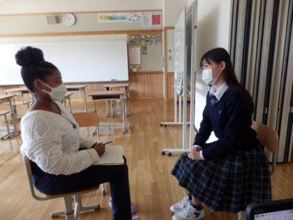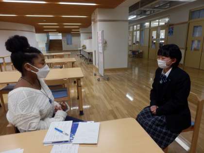 今日もパフォーマンステストの続きです。8年時に学習した英語でのコミュニケーションスタイルを意識して,ALTの先生とやりとりができていました。笑顔で相手の話をしっかり聞く姿勢,自分からたずねたり自分から情報を付け足して,よりコミュニケーションを豊かにしようとする姿勢は,本当にすばらしいです。