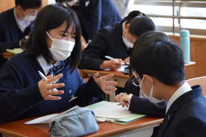 授業の冒頭は、生徒同士の教え合いで始まっています。