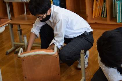 机・イスが自身の身長と合わず、姿勢が悪くなっていることから、自分たちで高さを調整しています。