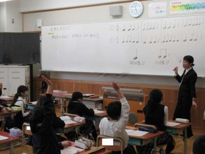 続いて4年3組(音楽科)の様子です。リズム打ちを楽しんでいます。