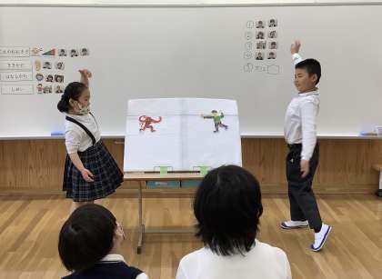 「お家でもジェスチャーをつけながら楽しく音読できるといいね」と話をしています。