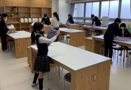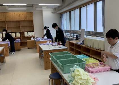 今日も学校のみんなが使うエプロン、ふきんをきれいにしています!