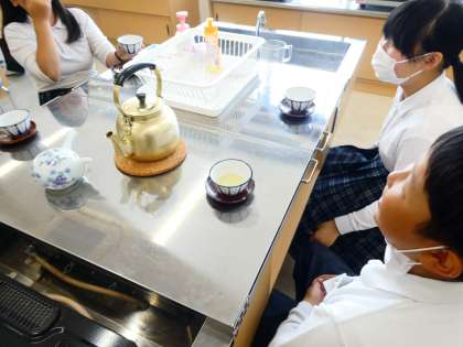 今日の家庭科の学習では、玄米茶、甘茶、ほうじ茶の3つからグループごとに相談したお茶を淹れて飲みました。