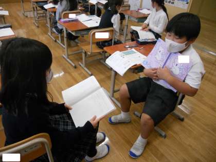 この写真は、ペアで自分の考えを伝え合っている様子です。自分の考えを図に表したり、教科書問題文やノートに書いたものを見せて説明したりしています。