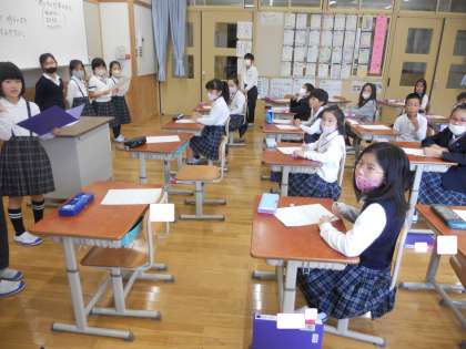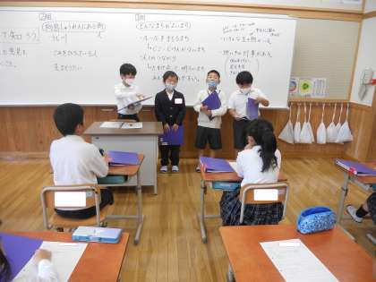 代表の人が自分のクラスで出た意見をまとめて他クラスへ伝えに行った写真です。ドキドキするけど立候補をして頑張って言ってみよう!と勇気を出したメンバーです。質問がきたり、初めての友だちの前で発表したりする人もいましたが、上手に伝えることができました。いきなり学年合同ですると、よけいに緊張も増してしまい、意見も出にくいので、まずは慣れた自分の教室で、数人ずつ入れ替わっての伝え合いにしました。今後、経験を増やしながら学年合同も取り入れていく予定をしています。