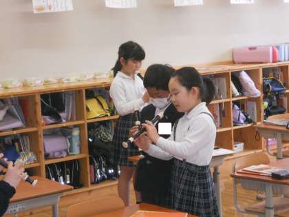 まだ運指は教えていませんが、音を出して喜ぶ生徒や弾ける曲を友だちに聴かせてあげている生徒、また、こんな風にするんだよ!と教えている生徒もいました。みんな嬉しさがあふれていました!