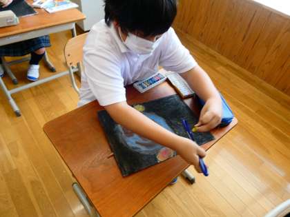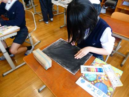 図工の学習では、コンテで黒くした用紙を消しゴムで消して作品を作っていました。