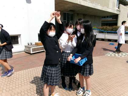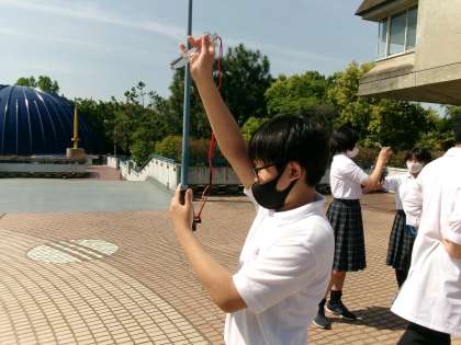 地学の講義では,「ソーラーパワー」について実験を通して調べました。まず始めにソーラーパワーを測る機械を使って,外に出て実際の太陽の強さを測ってみました。手を高く上げて機械を太陽に近づけてみたり,光を当てる角度を工夫したりしながら,どうしたらパワーが強くなるのか試していました。