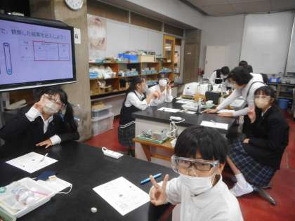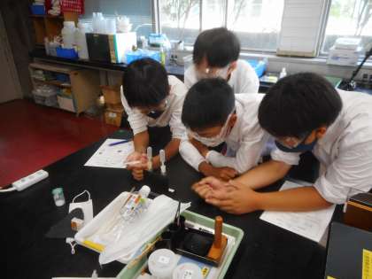 鉄とプラスチックに塩酸をかける実験をしています。鉄は反応して、泡が出てきました。このことから鉄はさびるということがわかりました。生徒たち、楽しそうに実験しています。