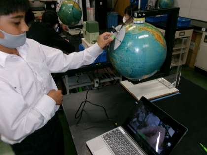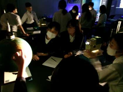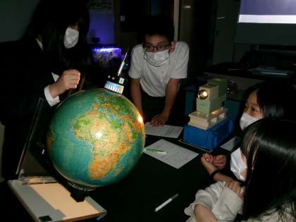 さらにそこから,なぜ季節によって太陽の高さや日照時間が変わるのかを特別な地球儀と光源電気を使って調べました。どのように太陽の光が当たると日照時間が変わるのかを話し合いながら考える姿が見られました。様々な実験を通して,太陽の高さや日照時間が変わることには,地軸の傾きが関係しているということがわかりました。