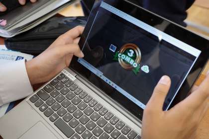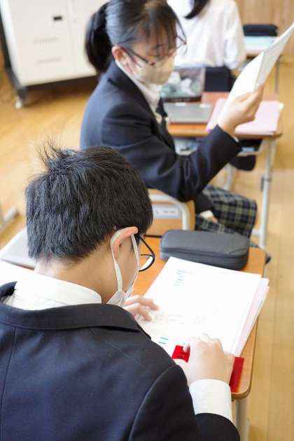 友だちと対話しながら、重要語句の理解を深める生徒。
