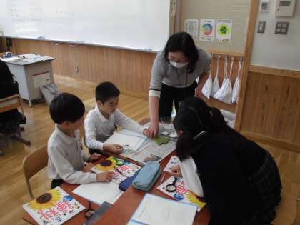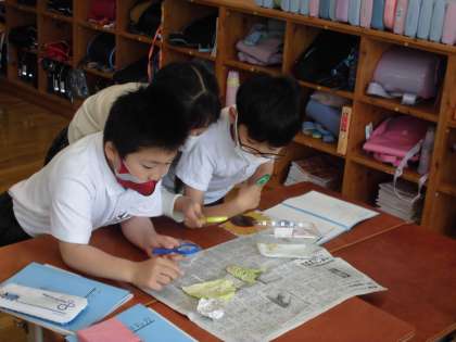 4月から理科の授業でモンシロチョウを育てています。写真は、観察記録をつけるために子どもたちが真剣に観察している様子です。アオムシが動いている姿を見て、生き物が生きていることを実感していました。チョウになって羽ばたく姿をみることが楽しみでもあるような、さみしいような…。