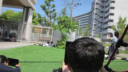 これから一年間観察を続け、生物の様子と気温との関係を考えます。快晴の空の下で、気持ちよく観察することができました。