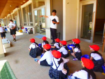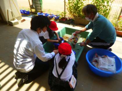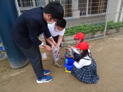 1組の生徒と一緒に、あさがおのたねまきをしました。