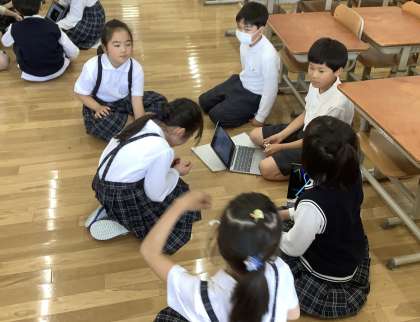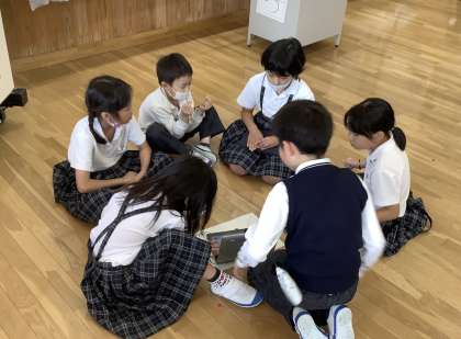 1〜4年生ベーシックステージのたてわりグループで交流会をしました。自己紹介や4年生の山の家の報告会などをしました。