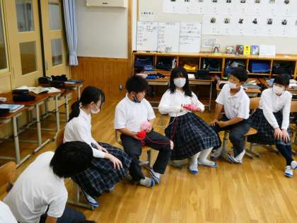 こころ科で使用するボールを作るために、4組は「いいクラスってっどんなクラス?」というテーマで自分の考えをみんなに伝えながら毛糸をつつに巻いてボールを作成しました。