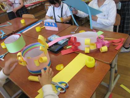 カラフルなわっかかざりや、ブレスレットを作ったり、動物の被り物などいろんなものに変身しています。