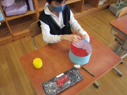 今日の図工ではいろいろな大きさ・色・形のわっかを使って、大変身しました!