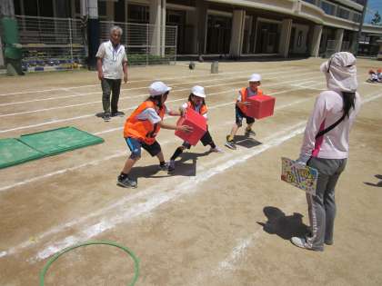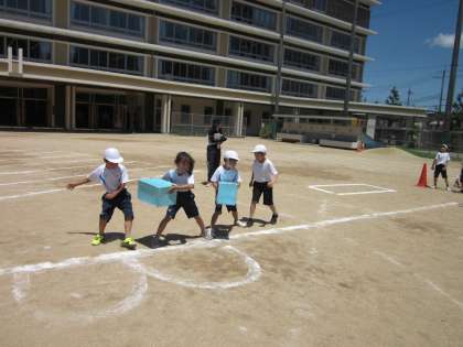 はじめは、はこを隣に渡すのが難しく少し苦戦しましたが、同じチーム・ペアの友達とたくさん話合い、最後はとても上手に箱を回していました!