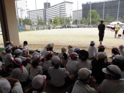 100m走の準備ができると,「あーか!」「きいろー!」「あおがんばれ!!」