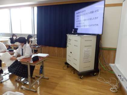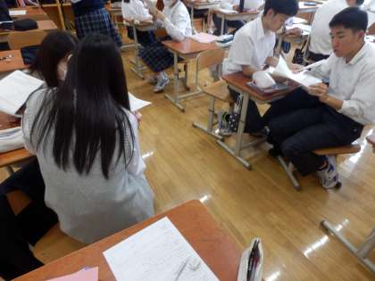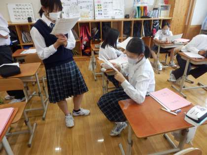教科書の単元にはありませんが,9年生は先週の愛媛の思い出を英語で書いています。9年生になるとすらすらと書くことができる生徒が増えていて,いつもよりたくさん英文を書いていました。ペアで,お互いが書いたものを真剣に読んでいました。