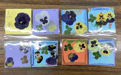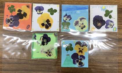 今日はその花を使って壁面飾りを作りました。コースターとしても使えます。とてもきれいです。