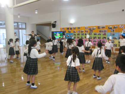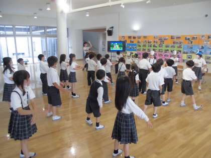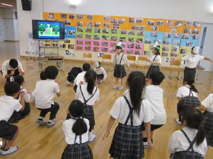 「昆虫太極拳」でカマキリ・ダンゴムシ・カメムシなど、いろいろな昆虫の真似をしました!どんどんスピードが上がって「できた!むずかしい!」と1組の友だちと仲良く活動できました。