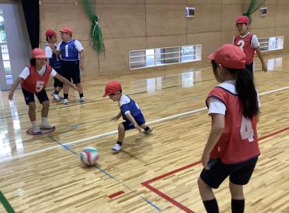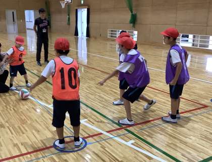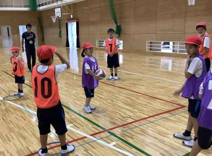 ペアの友だちにうまくパスできるように、声をかけたり、合図をしたりしています。