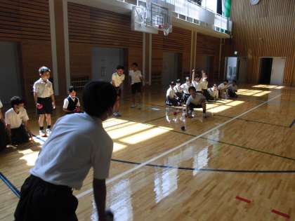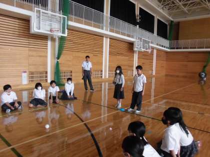 ボールの1組の友達から投げ方やルールを教えてもらいながら,