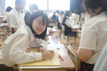 友達と嬉しそうに答案の見せあいをする瞬間をキャッチしました!!