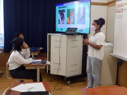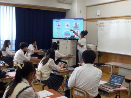 英語の授業ではALTのイタナ先生から,アメリカでの絶滅危惧種の話を聞きました。アメリカでは,1300種類の絶滅危惧種があるそうです。今日は,オオカミやハチなどいくつかの種類のことについて詳しく話を聞きました。その後,子ども向けの海外の動画で,それぞれの動物がなぜ危機に瀕しているかを聞き取って,それについてどう思うかを英語で書きました。