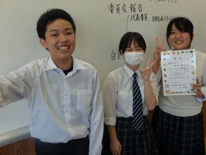 健康委員会からは「おいしく食べよう!給食ウィーク」でのクラスで協力して給食準備を早めたで賞の賞状の授与が。ほめてもらえるのは何年生でもうれしいですね。写真はいつも給食準備をがんばっている人です。代表で賞状をもらいました。