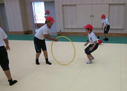 フラフープをみんなで転がして、キャッチボールをしたり、転がした中を上手にすり抜けたりしています。