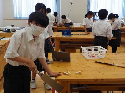 のこぎりを使って木材を切る方法について学びました。