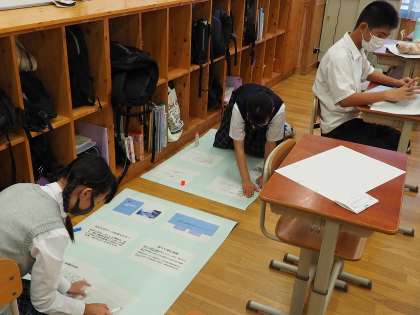模造紙に貼付けしたり、発表メモで計画を立てたり。