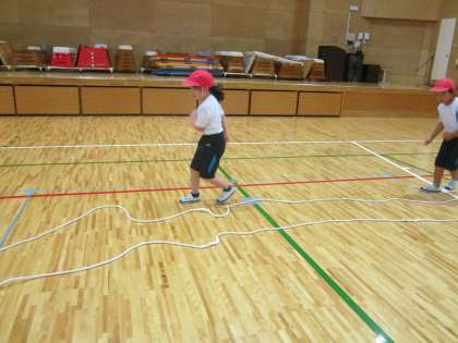 跳ぶときに、片足でジャンプ・両足でジャンプなどみんなで工夫もしながら、活動しています。